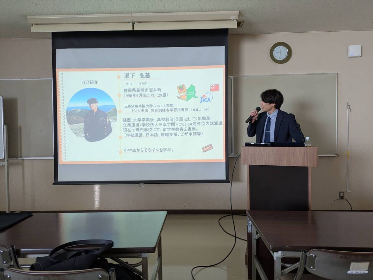 今回は元JICA海外協力隊の瀬下先生を講師に迎え、海外での指導現場について貴重なお話を伺いました。